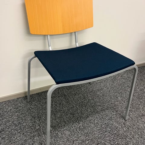 Tuoli, jossa metallirunko, pehmustettu istuin ja vaalean puu selkänoja. Sopii sisäkäyttöön esimerkiksi ruokailu- tai työtuoliksi. 7kpl. Valmistaja isku.