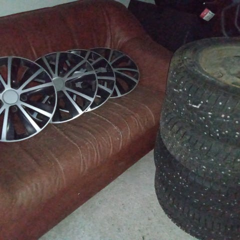 Yksi vanha Goodyear Ultra Grip 2 145SR13 74Q nastarengas Opelin 5x13 ET49 -peltivanteella.