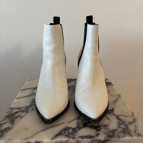 Erittäin hyväkuntoiset, vähän käytetyt, mustat Acnen Cypress nilkkurit. Hieman normaalia käytön jälkeä koroissa ja kenkien kärjessä. Nahkaa, takana mokkanahkaa, korko nahkaviilutettu, nahkapohja sisällä ja osittain ulkopohjassa. Vaihdetut korkolaput ja pohja priimakunnossa. Koron korkeus n 9 cm.