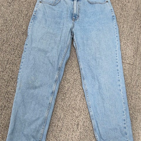 Farkut, joissa taskun- ja lahkeensuut on kulutettu näyttämään paljon käytetyiltä. Kangas on vahvaa ja napakkaa. Vyötärönympärys on noin 88-89 cm ja farkkujen pituus on noin 96 cm.