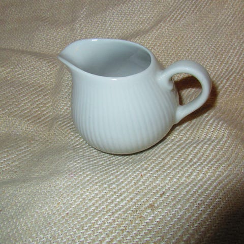 Arabia 6360 PRIMAVERA kermakko 1969 ja alusta. Kermakko on keraamista materiaalia, koristeltu vihreällä kukkakuosilla. Lautanen on myös keraaminen, samankuvioinen ja sopii kermakon kanssa käytettäväksi. Tuotteet soveltuvat tarjoiluun ja pöytäkoristeeksi.