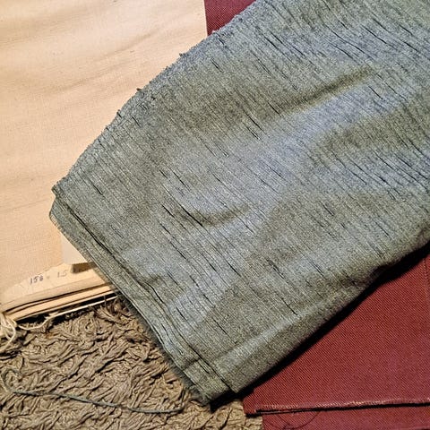 Erilaisia sisustus ja huonekalukankaita sekä yksi tikkikangaspala