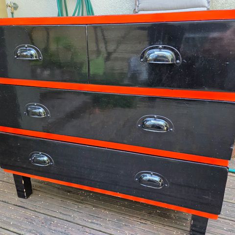 Puinen lipasto, ostettu Indiskasta yli 20-vuotta sitten. Elämisen jälkiä tietysti näkyy, mutta laatikot täysin ehjät ja toimivat. Pintaa ei ole koskaan hiottu, joten entisöinti ei liene mahdotonta. Tästä ihanuudesta on nyt vaan, tilan puutteen vuoksi, pakko luopua (kuvaan tunkenut kissa ei sisälly kauppaan).