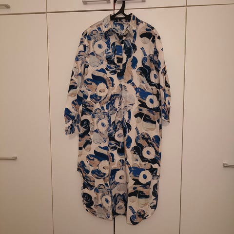 Myydään vain soviteltu Marimekon 'Sinililja Maisema Unikko' mekko. Kaulukset, napit hiansuissa ja edessä, kiristysnauha vyötäröllä, taskut sivusaumoissa, pyöristetty helma, halkiot sivuilla.