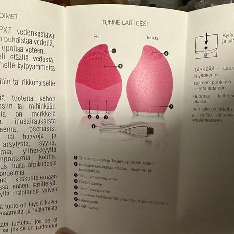 Myydään uusi, käyttämätön kasvojen puhdistuslaite. Alkuperäispakkausta tai ohjekirjaa ei ole enää tallella. Laitteessa kiinni oleva N-harjaspää on tarkoitettu normaalille ja rasvaiselle iholle, S-harjaspää herkälle iholle, E-harjaspää ihon kuorintaan ja M-harjaspää ihon hierontaan. Toimii AAA-paristoilla. Kerran virtanappia painaessa käynnistyy nopeustaso 1 ja kaksi kertaa painaessa nopeustaso 2, pitkään painaessa sammuu.