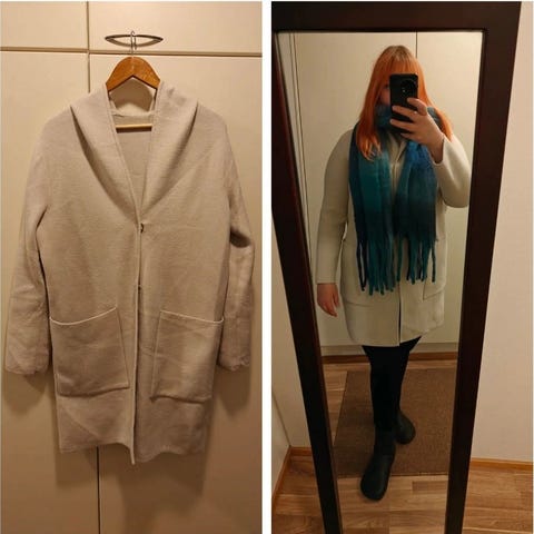 Ihanan lämmin neuletakki, neulososassa 50 % villaa, mokkanahantapaista etuosassa ja tekoturkista sisäpuolella.