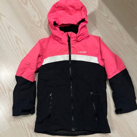 Everestin laskettelutakki koko 134. Irroitettava ja säädettävä huppu, lumilukot hihoissa ja vasemmassa hihadssa tasku hissilipulle.