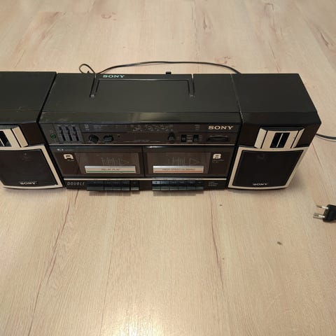 Sony CFS-330L Stereo Cassette Player, nelivärinen stereolaite, jossa kaksi kaiutinta ja kasettisoitin. Laite on valmistettu Japanissa ja se on suunniteltu käytettäväksi 220V-240V sähköverkossa. Sopii 4-band-äänentoistoon ja sisältää säädettävät äänenvoimakkuus- ja äänenlaatuasetukset. Toisessa kaiuttimesta jotain häikkää
