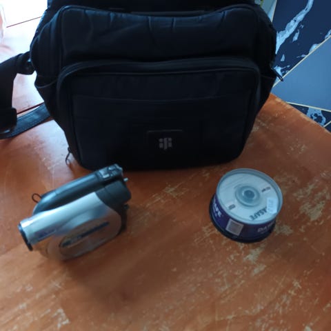 Panasonic M7 videokamera, mukana kantolaukku ja tarvikkeet. Laite on suunniteltu videokuvaukseen ja sisältää perusominaisuudet videon tallennukseen.