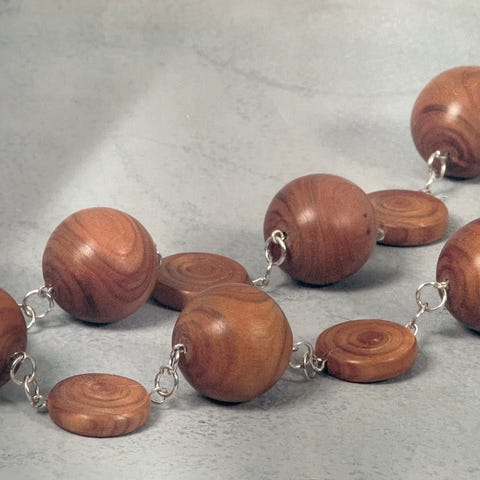 Eksoottisista puulajeista: wenge ja heartwood, käsityönä valmistettu kaulakoru (pituus 80cm) ja rannekoru (pituus 22cm)). Käyttämättömät.