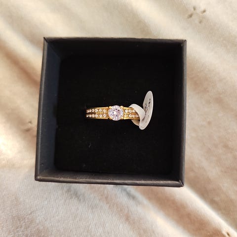 Kaunis sormus zirkoneilla. Ruostumatonta terästä. 18k kultaus. Koko 18,1 (8). Postitus onnistuu myös kirjeenä 2,80e. Myytävänä myös muualla.
