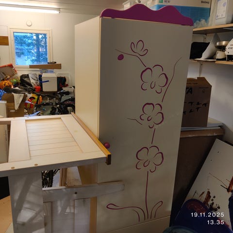Hyvä kuntoinen lastenhuoneen kalustukseen sopiva lipasto kukka kuvioilla.