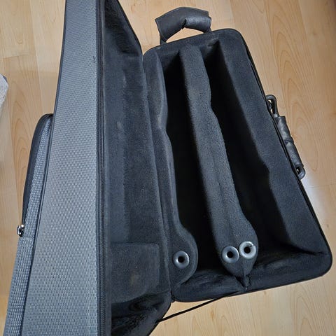 Schagerlin mainio laukku trumpetille. Sivuosasto nuoteille sun muulle. Paikat kahdelle suukappaleelle ja osasto sodiinoille. Jemmattavat reppuolkaimet. Mahtava ja jämäkkä laukku loistokunnossa.
