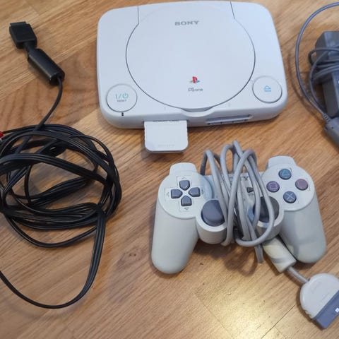 Sony PlayStation PS One pelikonsoli harmaa väri, sisältää kaksi ohjainta. Konsoli on muovikuorinen ja soveltuu klassisten PlayStation-pelien pelaamiseen.