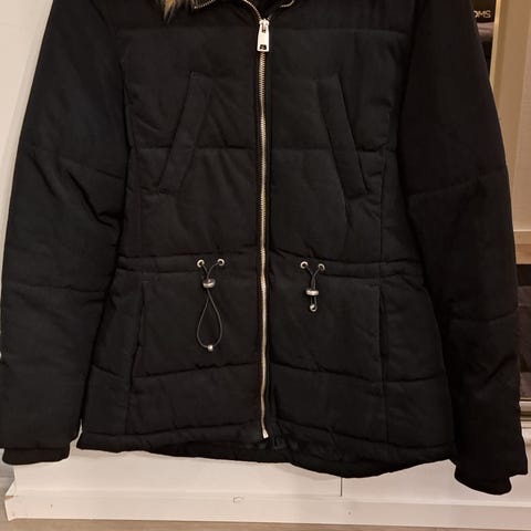 Siisti, hupullinen takki, paljon taskuja edessä. Yli pepun oleva malli.