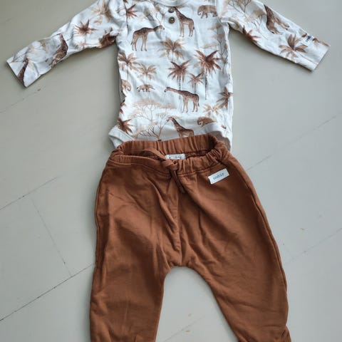 Newbie vauvan vaatesetti koko 68 jossa vauvan body metsäneläin kuosilla ja vaaleanruskea meleeratut housut. Pohjaväri luonnonvalkoinen ja housut. Uutena ostettu ja siisti kunto. Pesty hajusteettomasti.