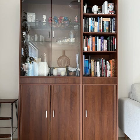 Myydään meille tarpeettomana valkoinen puinen hylly/kaappi lasiovilla. Ovet liukuvat auki hyvin. Yksi kaapin vedin irronnut, mutta koetan laittaa sen vielä paikoilleen. Lasit ehyet ja siistit. Puussa joitain naarmuja/hiertymiä, mutta niiden osalta perusilme siisti. Moitteiksi laskisin kaapin päälilevyn, joka puuttuu ja tilalla käytetty vain yhtä hyllylevyä. Siistillä kalustelevyllä saa hienon! Kaapin sivuilla metalliset ohuet listat, joilla ehkä koetettu pitää erillinen yläosa paikoillaan, mutta vähän vääntyneet. Nyt repsottavat paikoillaan, kun ei olla päätetty mitä niille tehdään.