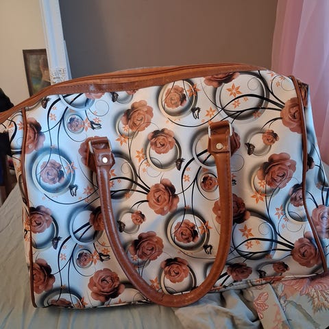 Myydään ruskea kukkakäsilaukku. Takana vetoketjutasku.