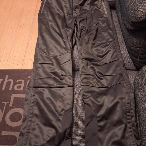 Käytetyt, mutta päällisin puolin täysin ehjät lasketteluhousut henkseleitä, taskuja ja vetoketjuja myöten.