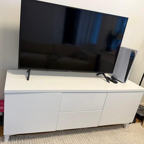 Tämä 150 cm leveä tv-taso tarjoaa tilaa televisiolle ja mediavarusteille, mutta sen matala korkeus ja siro muoto pitävät huonetilan kevyenä.