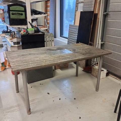 Jatkettuna 8:lle ruokailijalle pöytätilaa tarjoava pöytä. Olisi hyvä maalata.