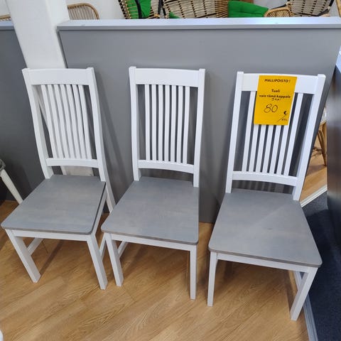 Siistit harmaalla kankaalla päällystetyt tuolit mallipoisto hintaan.