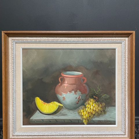 Tyylikäs viiniaiheinen asetelma, maalattu öljyväreillä kankaalle.