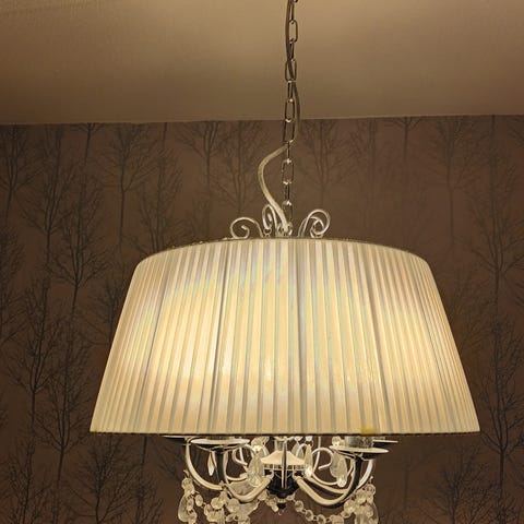 Kattovalaisin, metalli/"akryylikristallikruunu", 5-haarainen, paljon koristeellisia "kristalliosia". Valaisin on tarkoitettu ripustettavaksi kattoon, ripustusketjua on n 1,5m, joten se on helppo asentaa haluttuun korkeuteen. Mukana asennusohjeet. Valaisin ei ole ollut aikaisemmin liitettynä sähköön, vaan on ollut viime kesänä katetulla terassilla koristeena. Sopii sisustukseen, jossa halutaan korostaa klassista tai ylellistä tyyliä.
