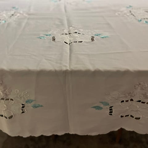 Jättikokoinen juhlava silkkimäinen pöytäliina, jossa on punaiset kukkakoristeet. Käyttämätön. Pöytäliina on vaalean pohjavärinen ja siinä on kirjailtuja kukka-aiheita sekä leikkaustyön yksityiskohtia. Kotiinkuljetus lähialueelle tai Tori-diili.