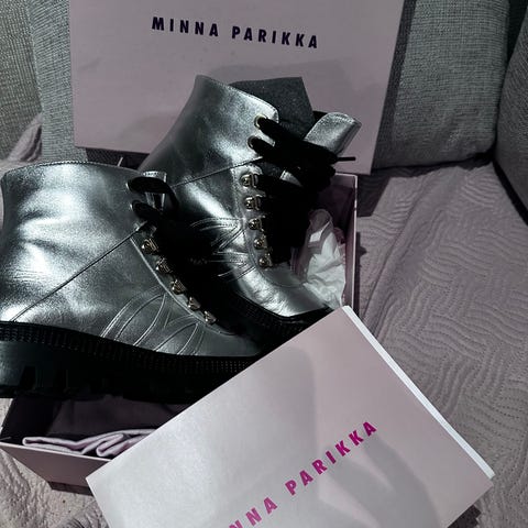Kerran käytetyt mustat talvikengät. Sivussa vetoketju ja sisällä karvavuori. Vasemman kengän päällä on pieni painauma (näkyy yhdessä kuvassa). Se on ollut siinä jo ostettaessa. Kengät ovat nahkaa. Sisämitta on noin 25 cm.