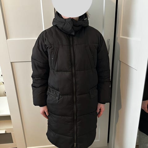 Hyvässä kunnossa oleva naisten pidempi talvitakki. Lämmin ja noin polviin asti pitkä. Väriltään enemmän ruskean punainen. Taskuissa ei ole vetoketjuja, rinnuksen kohdalla vetoketjulliset taskut ja vyötäröllä kiristysnauha. Hupusta saa karvareunuksen irti, joka on kiinni vetoketjulla ja kahdella napilla. Karva hyvässä kunnossa, kun ei ole ollut käytössä.
