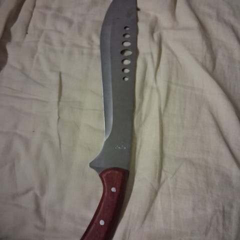 Puukon / veitsen merkki tuntematon, todennäköisesti keräilyesine. Ei ole samannäköistä tullut vastaan, vuosiluvun veikkaan olevan 1950-lukua. Todella vanha, hieman entisöity ja hyllyllä pidetty. Terä tylsä tarkoituksella, ei sovellu minkään sortin yleiskäyttöön. Kahvan päädyssä messinkinen leijonasymboli, sekä kultaista (ei aitoa kultaa) koristeyksityiskohtaa.