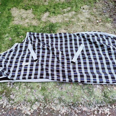 Ehjä siniruudullinen talliloimi fleecevuorella. Karvat kaupanpäälle. Etuosa reilun kokoinen, omalla valui taakse. Koko 165cm.