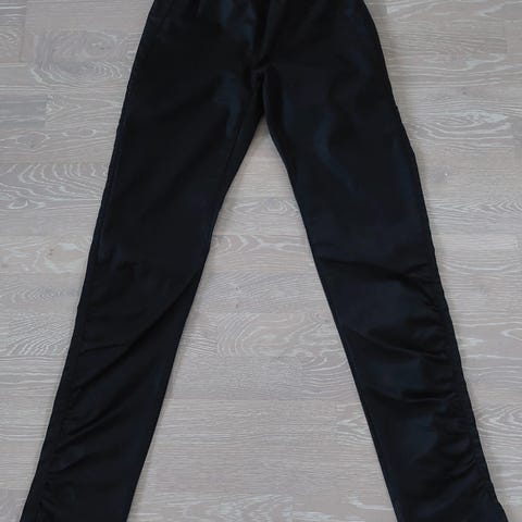 Mustat housut, jossa kuminauhavyötärö. Molemmilla puolilla on reisitaskut. Housuissa on myös takataskussa. Edessä on valetaskut. Vähän haalistuneet pesussa. Mitat: 1/2 vyötärö 38 cm ja pituus 94 cm.
