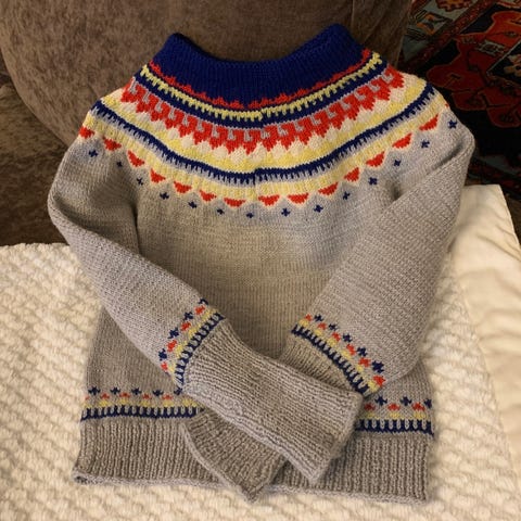 Uusi islannin villapaita lapselle. Värit harmaa,turkoosi,valkoinen ja violetti. Lettlopi langasta.Koko arvio 2 vuotiaalle. Leveys kainaloista 32cm.Kokonaispituus kauluksen reunasta 42cm.Ostaja maksaa mahdolliset postikulut.
