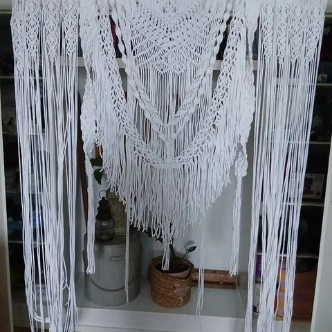 Myydään uusi, Paulina-punoskuteesta valmistettu makramee. Makrameen korkeus on 38 cmja leveys 34 cm, kepin pituus 48 cm.