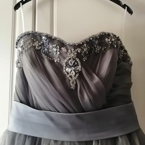 Kyyhkyn harmaa kaunis vanhojen tanssimekko. Koko ei ole ihan tarkka, mutta selän nyöreillä koko joustaa hieman kumpaankin suuntaan. Yläosassa kaunis pitsi. Saa tulla sovittamaan.