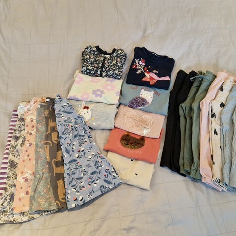 Sisältää 5x housut, 1x haalari, 1x huppari, 5x pitkähihaisia (ylhäällä kuvassa) , 3x t-paitoja (keskellä kuvassa) & 1x pyjama.