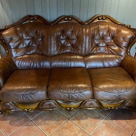Nahkasohvasarja, joka koostuu kolmipaikkaisesta sohvasta ja yhdestä nojatuolista. Väri vaaleanbeige, materiaali nahka. Sohva ja nojatuoli soveltuvat olohuoneen kalusteiksi. Sohvasarjan mitat ja tarkemmat tiedot eivät ole saatavilla.