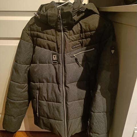 Musta, lähes uusi ulkoilutakki. Etutaskuissa vetoketjut, samoin sisätaskussa. Huppu.