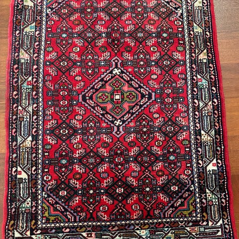 Käsinsolmittu villamatto. Pohjaväri punainen, koristeet mm. vaaleanruskeaa ja harmaan sinistä. Hyvässä kunnossa, aavistuksen verran käytön jälkeä.