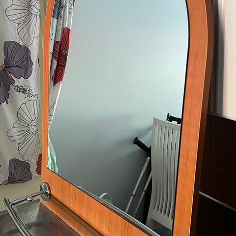 Hyväkuntoinen peili jossa pieni hylly.
