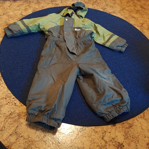 Remu talvihaalari, koko 92. Pepussa ja polvissa kulumaa, samoin lahkeen- ja hihansuissa, jalkalenksut puuttuu, mutta napit on paikoillaan. Pienen tahran löysin etuosasta näkyy kuvissa.
