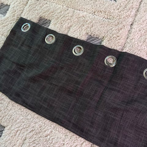 Ylhäällä kapea rypytysnauha, saa muovi klipseillä kiinni tai normaaleilla verhonipsuilla kiinni tankoon.