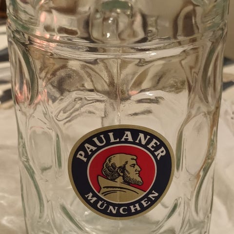 Myydään ehjä Paulaner München tuoppi joissa tilavuus runsaan litran verran. Korkeudeltaan 20 cm, halkaisija 10cm.