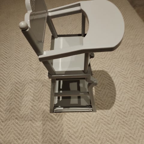 Valkoinen puinen nuken syöttötuoli. Maalipinnan hyvässä kunnossa. Varsin tukeva.