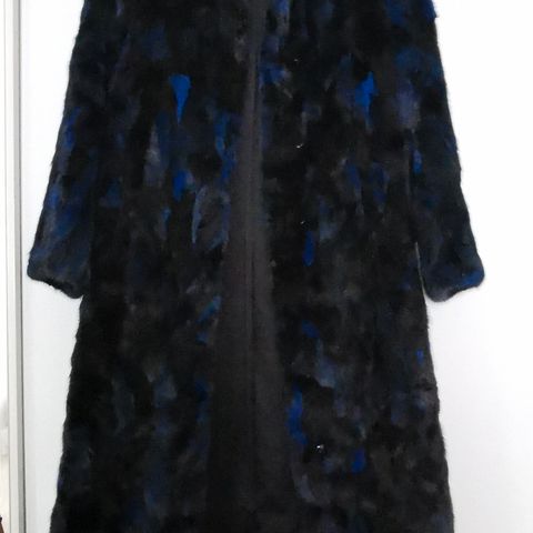 Tyylikäs, selkeälinjainen tumman sininen mokkaturkki. Pituus olkapäästä 93 cm leveys 55 cm.