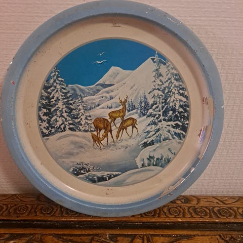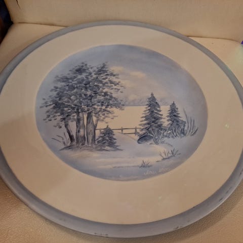 Maisema koristeellinen lautanen, jossa on maalattu kukkakuvio ja talo. Lautanen on valmistettu posliinista ja siinä on kullanvärinen reunus. Sopii koristekäyttöön tai esille asetettavaksi. Ei valmista ripustuslankaa, paikka on. 22 x 17 cm.