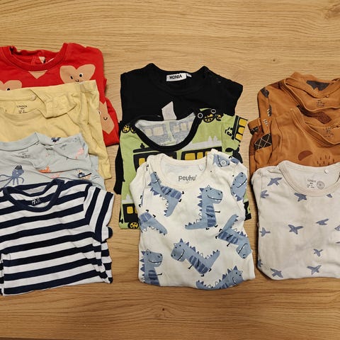 Myydään siistejä vauvan vaatteita. Paketti sisältää bodyja, housuja, paitoja sekä pipoja.