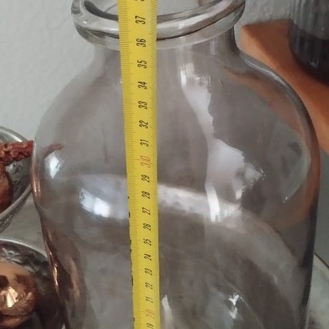 Iso lasinen koristepullo, jossa sisällä 2 led-valonauhaa rautalankaan kieputettuna sekä pohjalla koristekiviä.